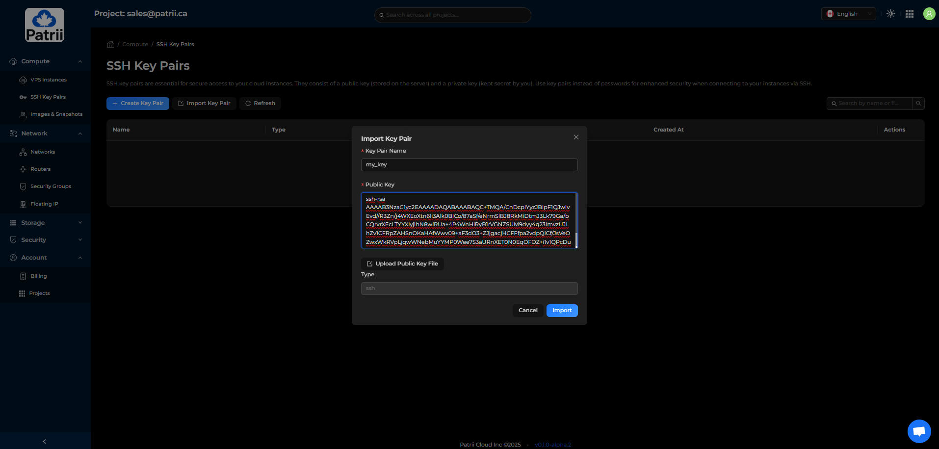 Patrii Cloud requires at least one SSH key before creating a VPS.