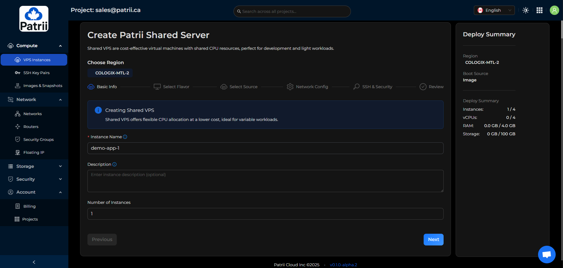 Go to Compute → VPS Instances → Create Instance → Shared VPS.