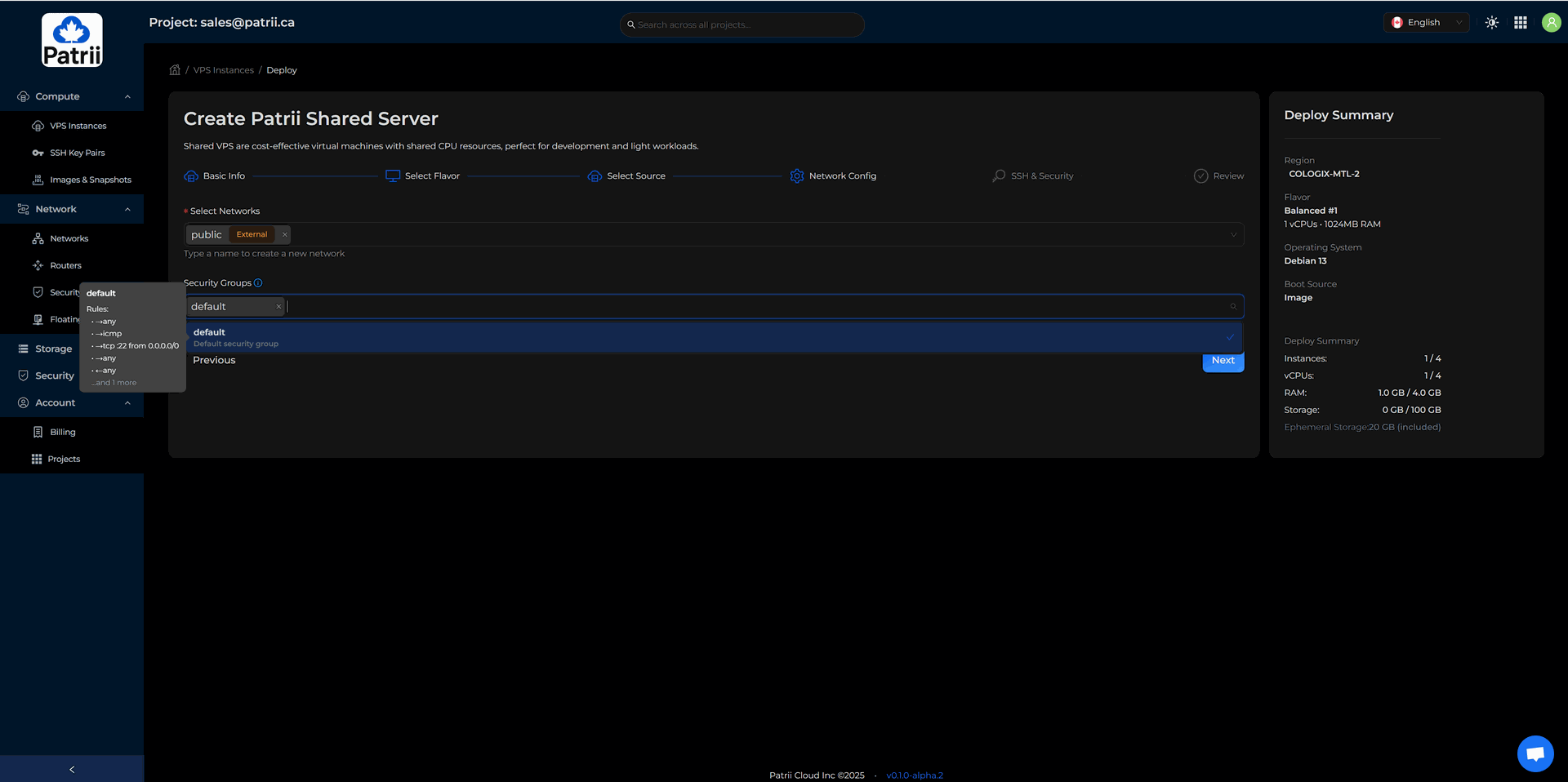 Patrii Cloud manages your perimeter firewall directly through Security Groups. This prevents lockouts and centralizes security.