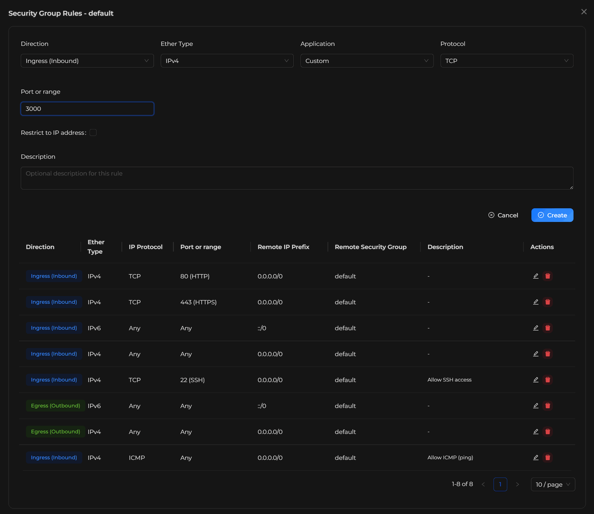 Your default security group allows ICMP and SSH from the outside world and all outbound traffic. You can edit this group or create additional ones later.